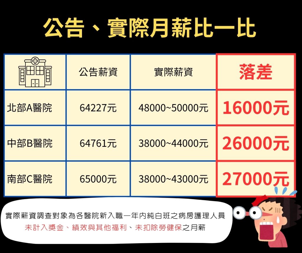 台灣醫療工會聯合會調查數家醫院,發現新進護理人員入職一年內的實際月薪普遍約在新台幣四至五萬元,而衛福部網站上公告的薪資卻動輒六萬元以上,存在明顯落差。不僅誤導社會大眾,更讓護理師被誤解為「薪水高卻一直喊辛苦」,扭曲護理人員的勞動處境。衛福部身為主管機關,應確保公開資訊的正確性與透明性,而非任由醫院以誇大數字誤導護理人員與社會。